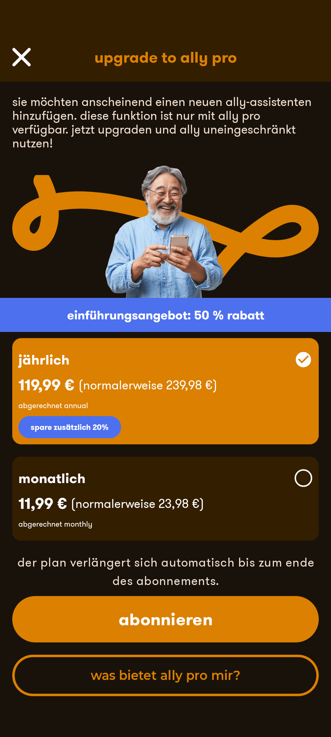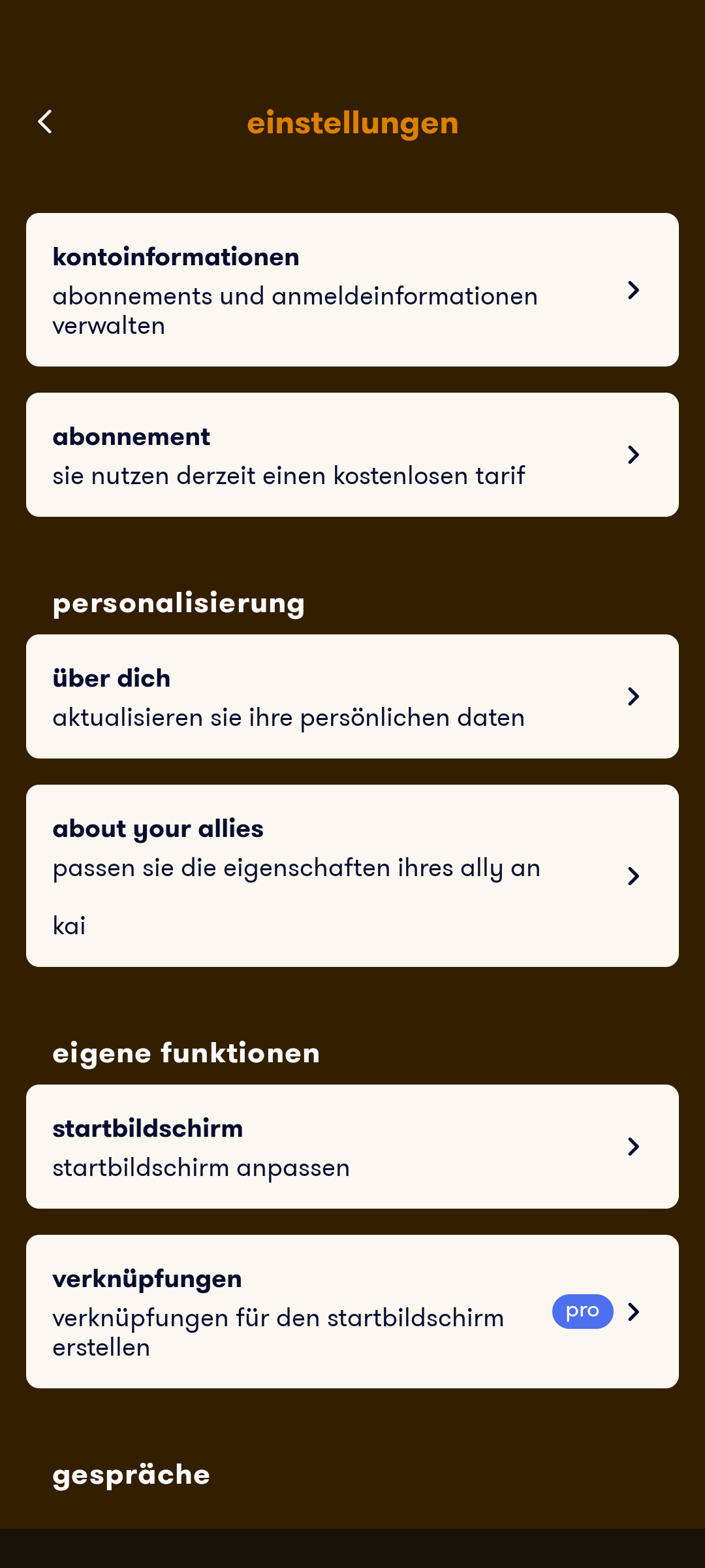 Weiterhin kann man in den Einstellungen personenbezogene Informationen hinterlegen, die neben dem Namen in Etwa dem oben beschriebenen entsprechen. Die Einstellungen der Allys lässt sich im Basiszugang nicht ändern. Im Web geht das gar nicht, wer das in der App versucht, kann wie in meinem Fall reproduzierbar die Standard-Allys verlieren. Eine Wiederherstellung ist aktuell nicht möglich, man muss also das Konto vollständig löschen und neu erstellen, wirklich gelöscht wird es auch hier übrigens nicht. Hat man wie ich im Web ein Jahresabo für $100 gekauft (das sind umgerechnet momentan 86,16 Euro), geht dies ohne Warnung ersatzlos verloren. Selbst beim Neuerstellen mit derselben E-Mail-Adresse erfolgt keine Zuordnung und ich weiß nicht einmal, ob es überhaupt mit gekündigt wurde. Mag sein, dass dies bei der Buchung in der App anders ist, aber probiert habe ich das nicht auch noch. ChatGPT und Perplexity verweigern beispielsweise das Löschen bei aktiven Abonnements.