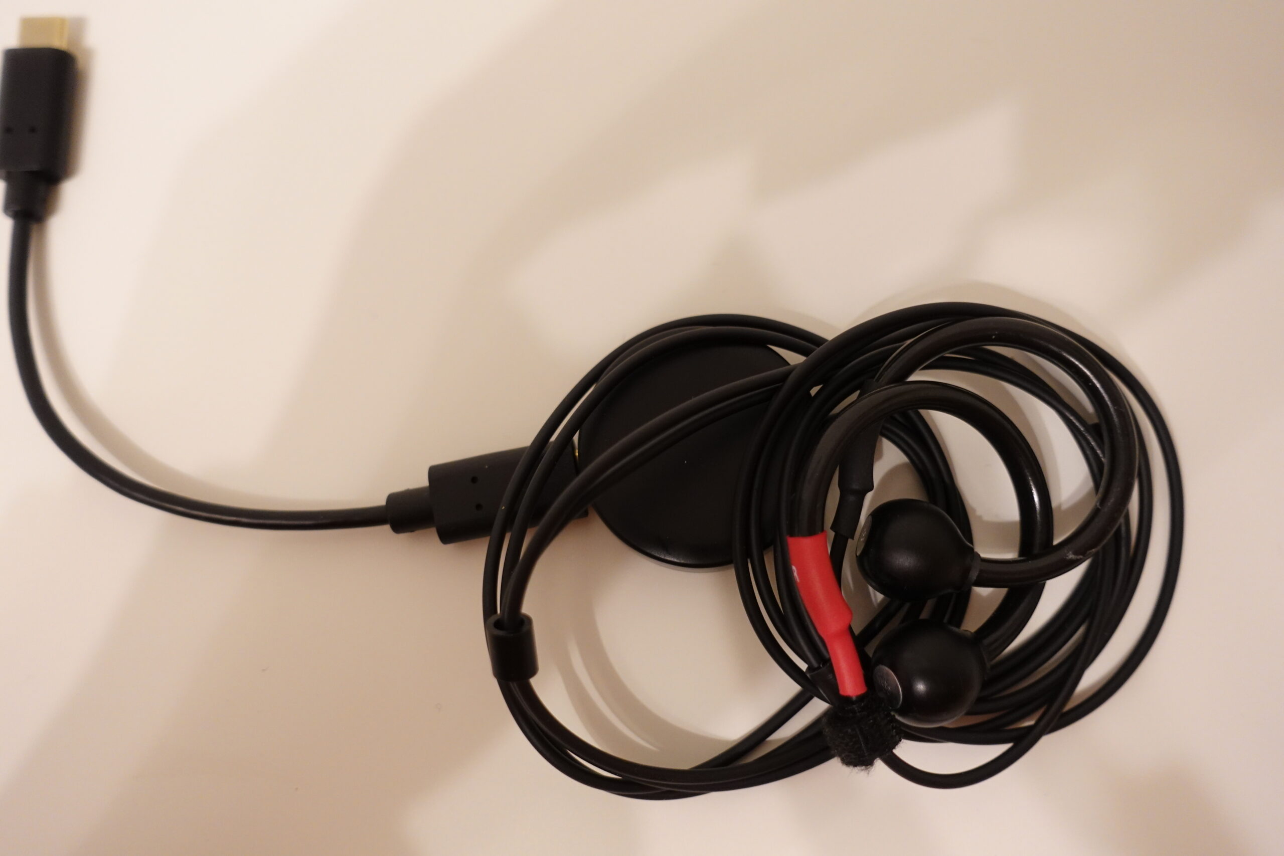 Die Kapseln mit einer Kugelcharakteristik erinnern an Lavaliermikrofone und sitzen in runden Kugeln am gebogenen Halter und zeigen nach unten. Die schwarzen Bügel werden über die Ohren gehängt und die Mikrofone sitzen somit direkt vor dem Außenohr. Die Kabel laufen hinten entlang, drei verschiebbare Verbinder erlauben ein gutes Management. Die Gesamtlänge mit Elektronik würde ich auf 1,4 Meter schätzen, das USB-C-Kabel ist weitere 15 cm lang. Einen Windschutz soll es optional geben, war aber auf der Webseite zum Bestellzeitpunkt nicht zu finden, jene für größere Lavaliermikrofone könnten passen. Der Hersteller gibt diesbezüglich Kaufempfehlungen auch für längere Ersatzkabel an. Die Kapseln sind durch kleine Gitter geschützt und leichter Wind ist recht unproblematisch.